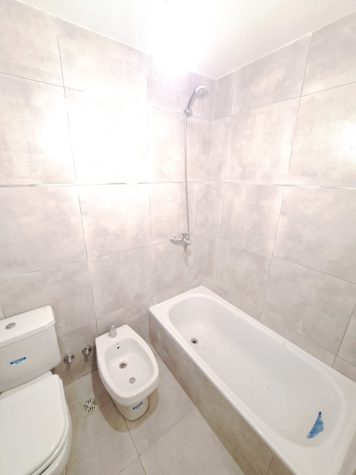 Baño completo con bañadera y pisos de porcelanato, grifería monocomando