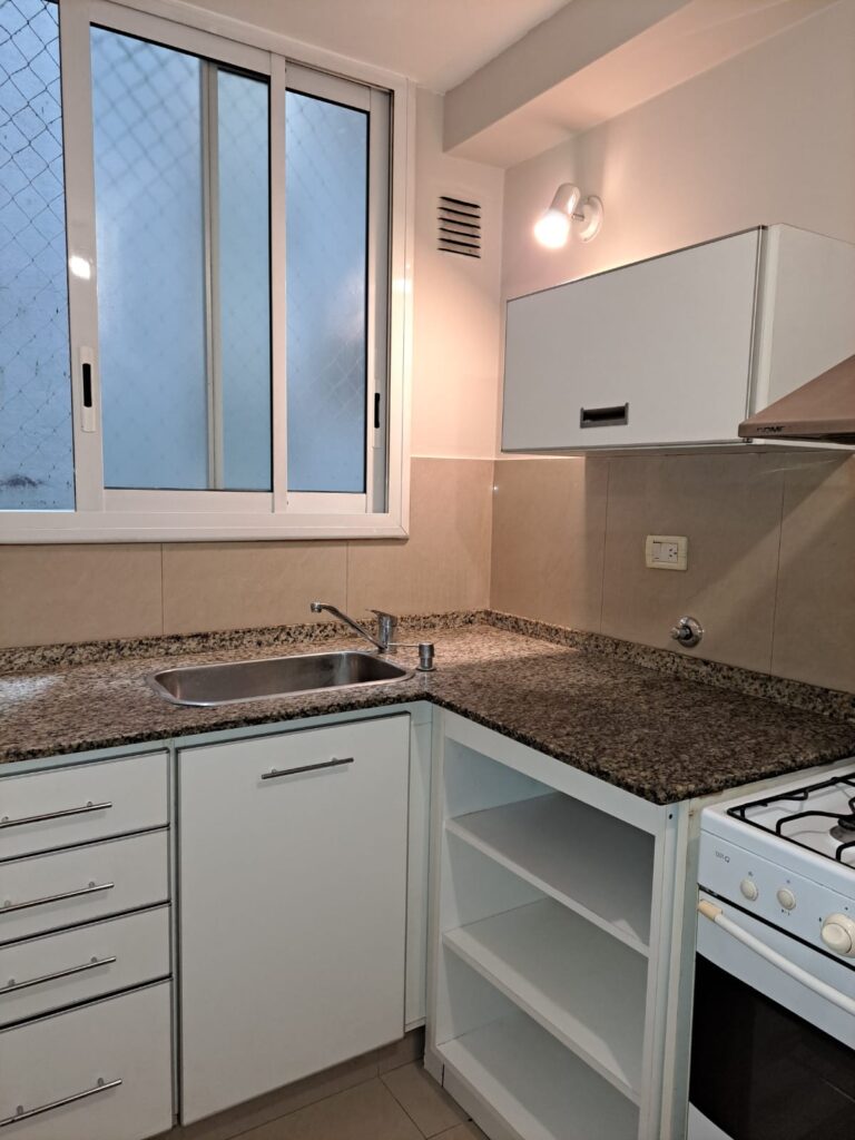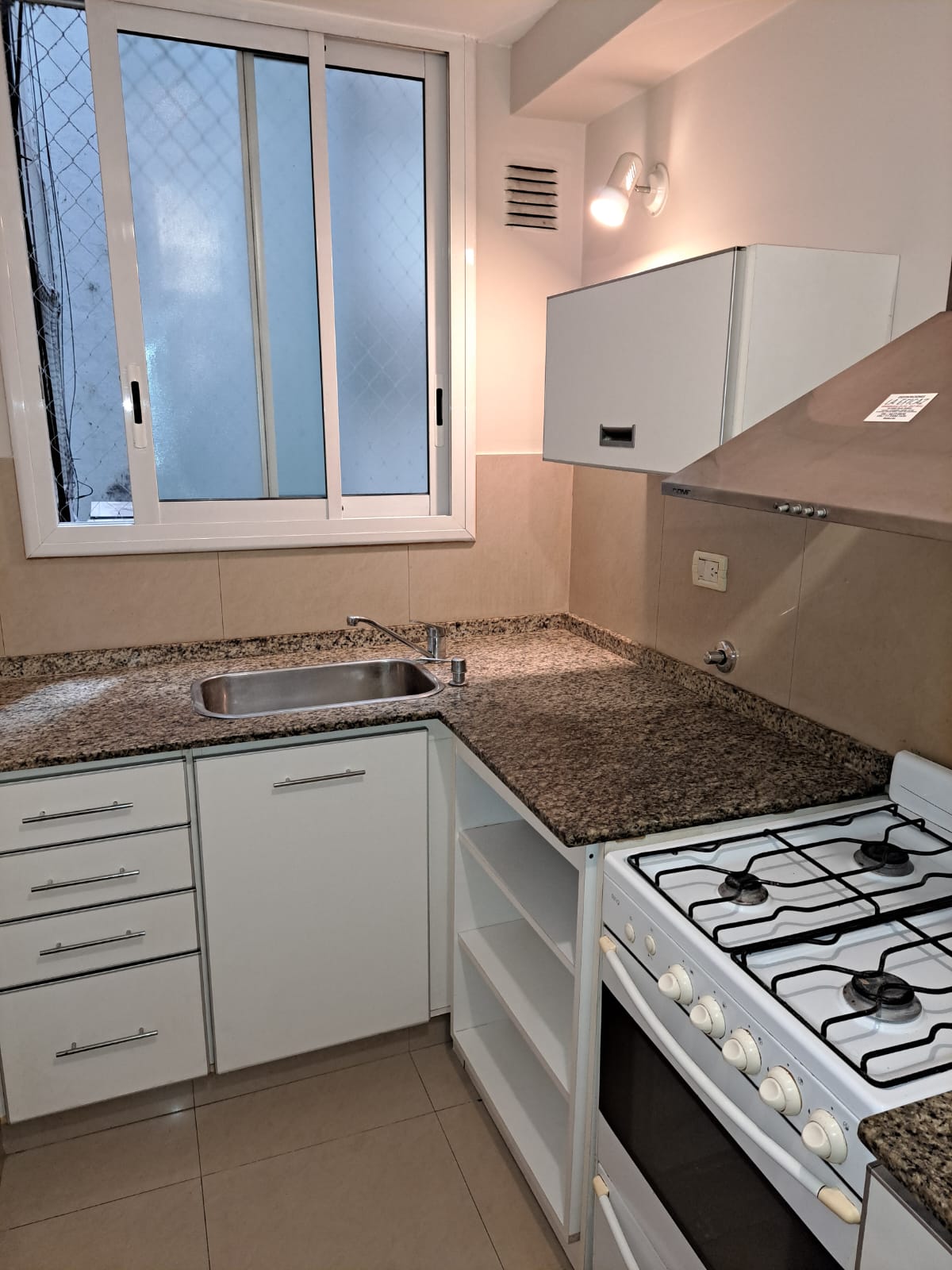 Cocina reciclada en impecable estado, con bacha de acero inoxidable, canilla monocomando, y mesada de granito lustrado, horno con 4 hornallas, alacenas, bajo mesada, y mueble empotrado para despensa, campana de aluminio de extracción, además cuenta con un espacio especialmente diseñado para el lavarropas.