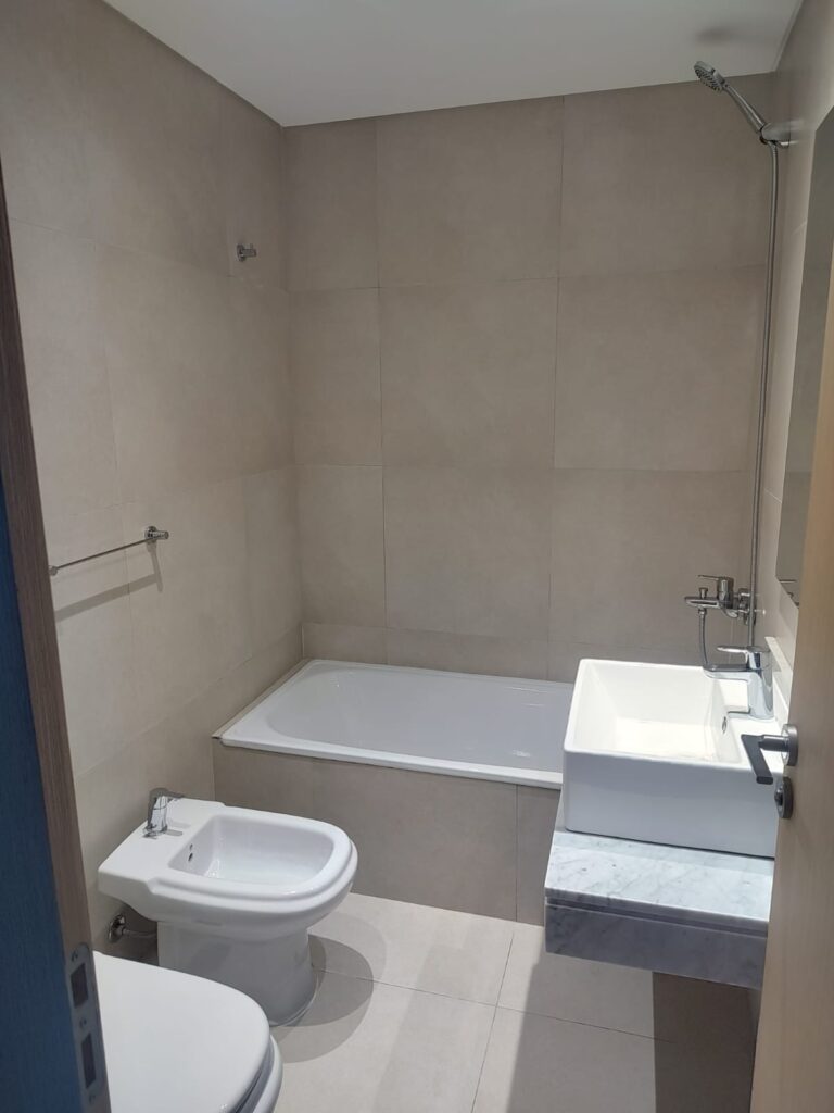 Baño completo con bañadera, grifería monocomando completa, moderno lavatorio, espejo