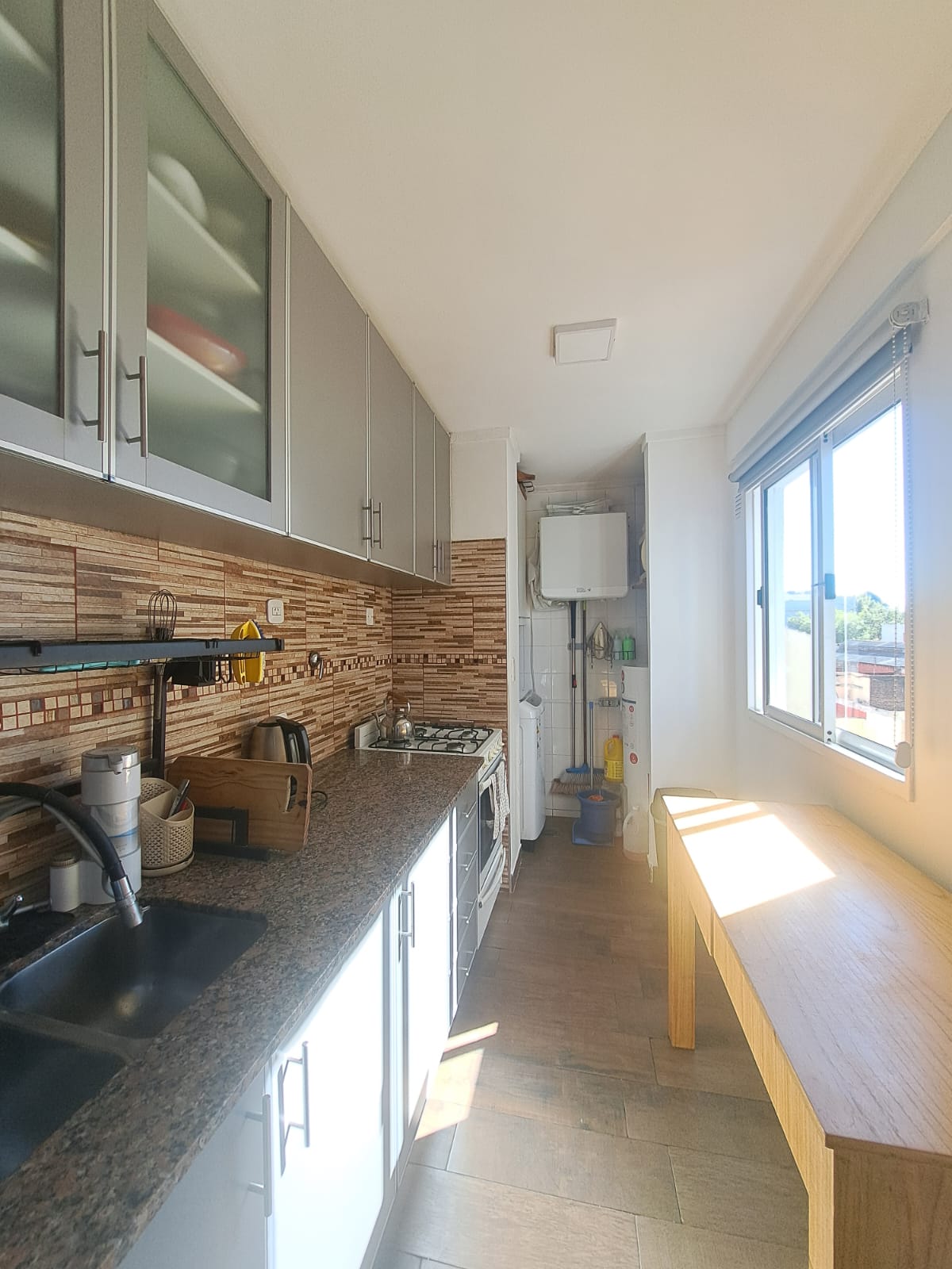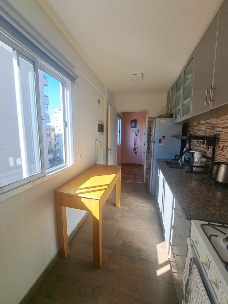 Hermosa cocina equipada con alacenas y bajo mesada con mesada de mármol granítico, termotanque eléctrico y cocina a gas, con conexión para lavaropas. Espacio para colocar una mesa, ventilación al exterior
