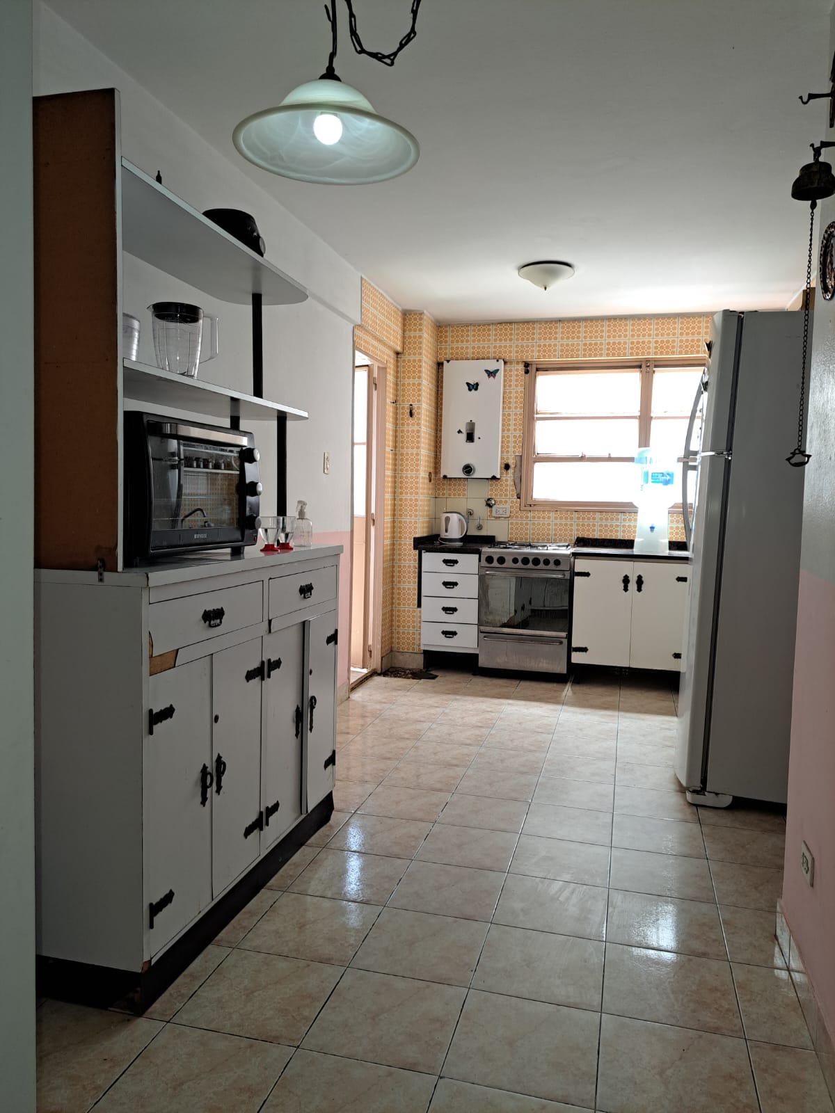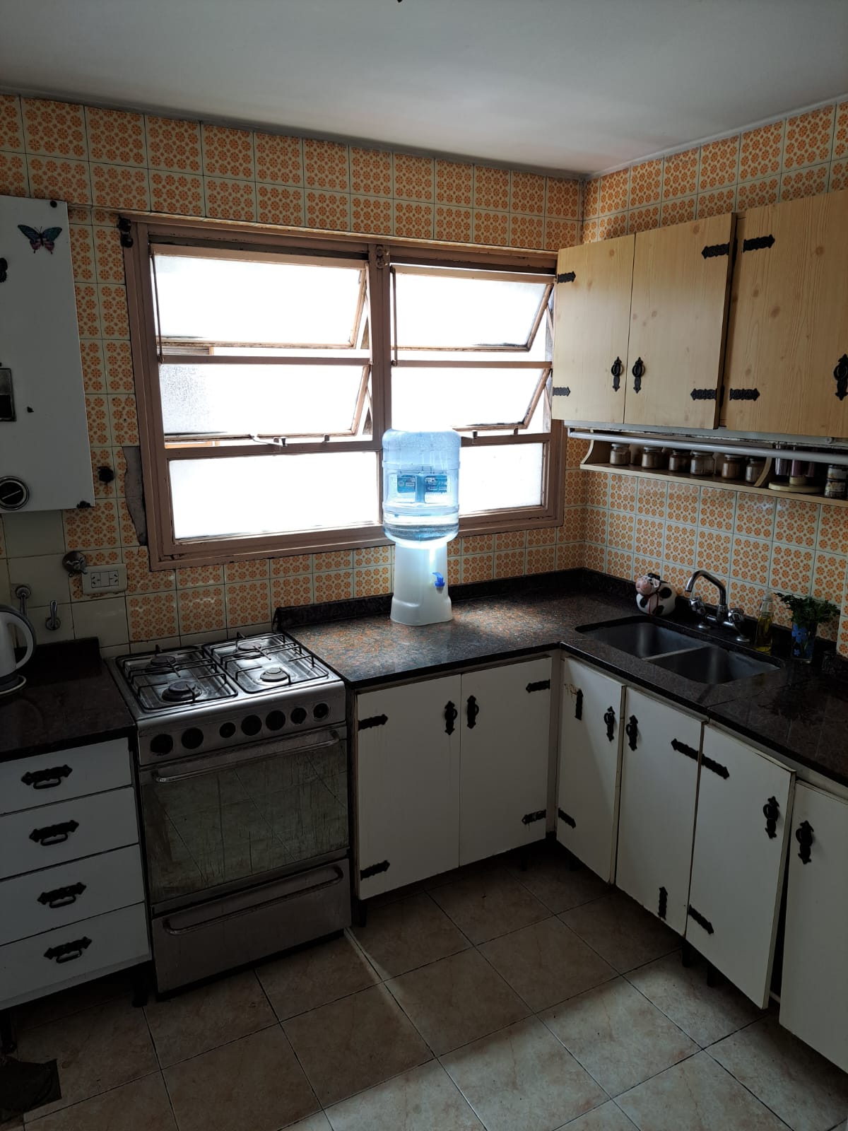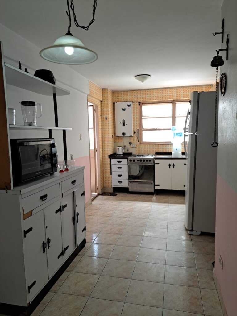 Amplia cocina – comedor con mesada de mármol granítico en L, bacha de acero inoxidable, con grandes alacenas y bajo mesada con puertas y cajoneras, mueble aparador complementario al bajo mesada, calefón y horno a gas con 4 hornallas, y ventanal que permite un gran ingreso de luz.
