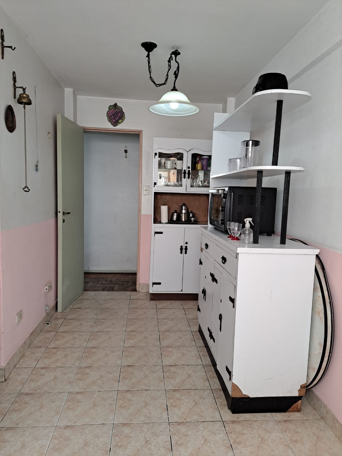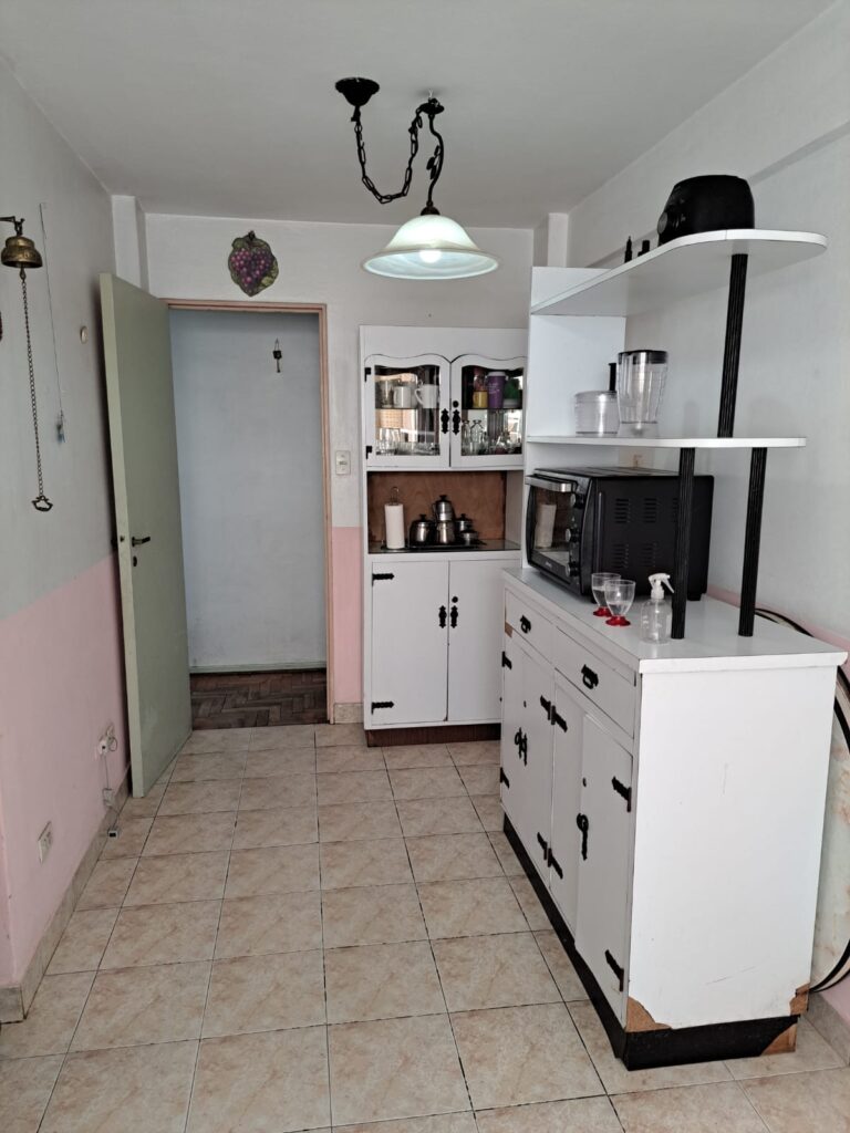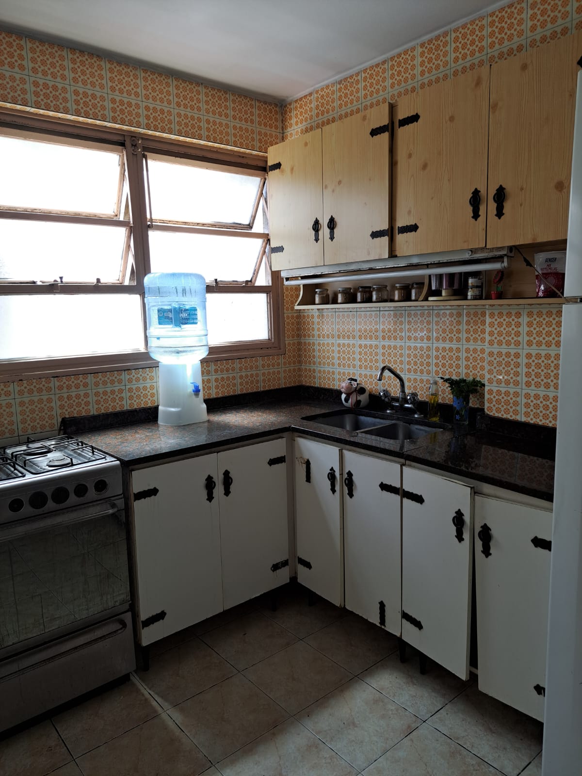 Amplia cocina – comedor con mesada de mármol granítico en L, bacha de acero inoxidable, con grandes alacenas y bajo mesada con puertas y cajoneras, mueble aparador complementario al bajo mesada, calefón y horno a gas con 4 hornallas, y ventanal que permite un gran ingreso de luz.