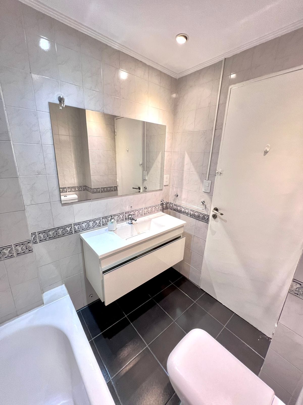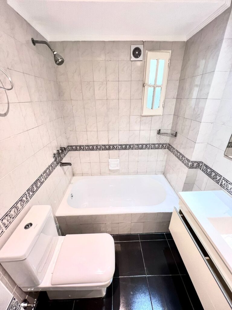 *Baño con moderno vanitory, bañadera laqueada, ventilación al exterior