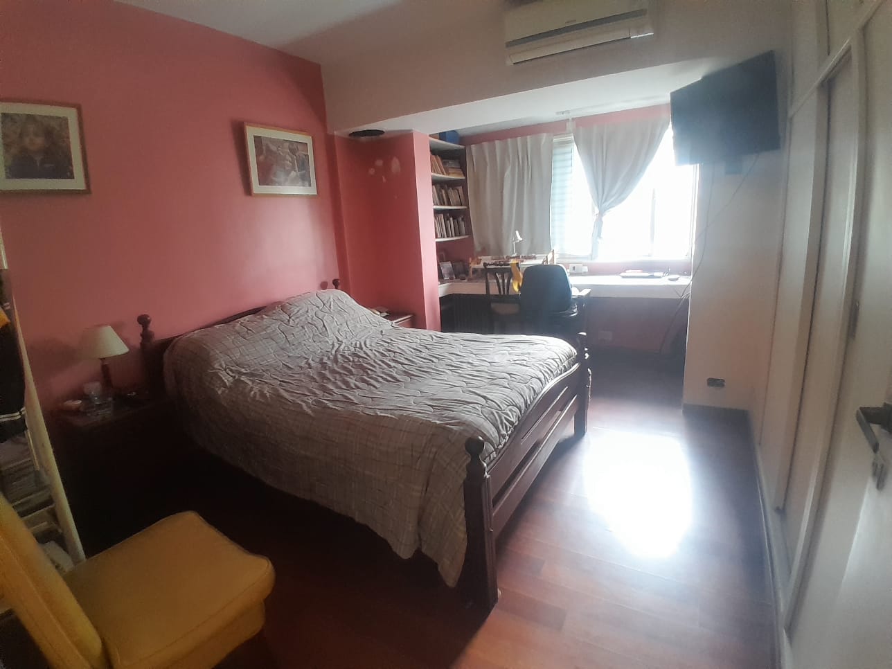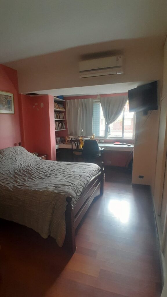 Dormitorio principal al frente (medidas 4.40*3.20) con escritorio, placard hasta el techo, aire acondicionado y piso flotante.