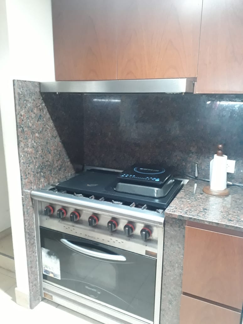Moderna cocina completa con doble mesada, con grandes alacenas y bajo mesada.