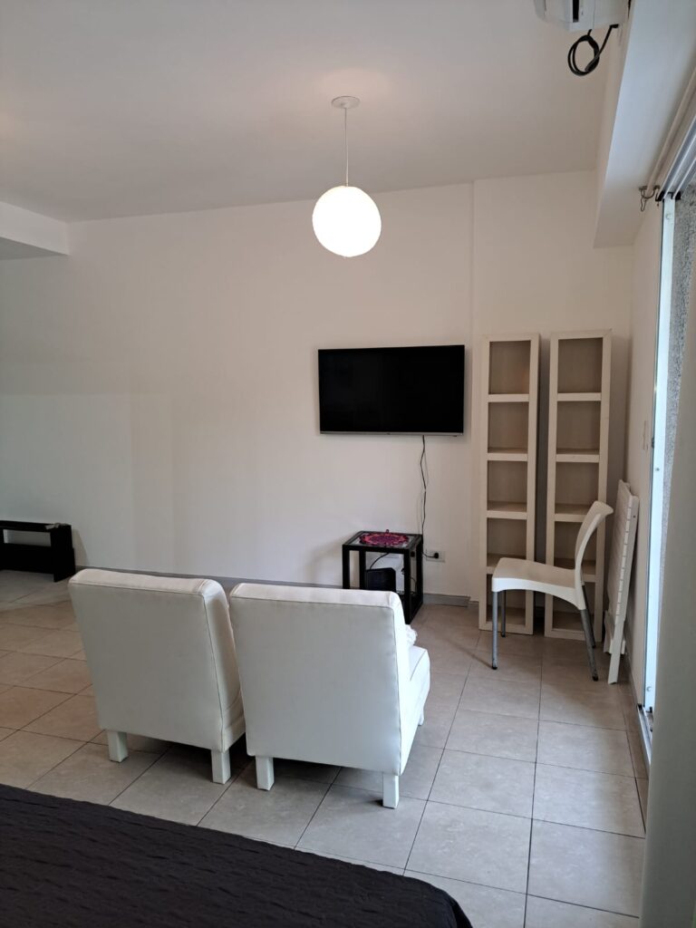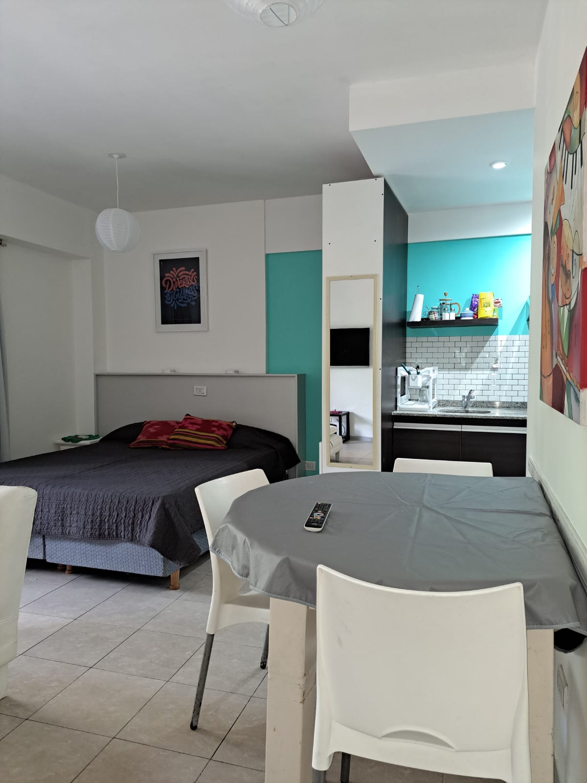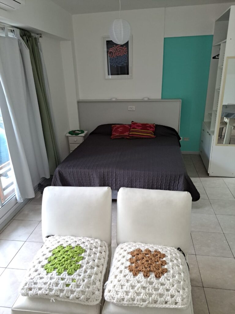 *Ambiente principal equipado con cama matrimonal, mesa con sillas, sillones individuales, TV , espacio de guardado